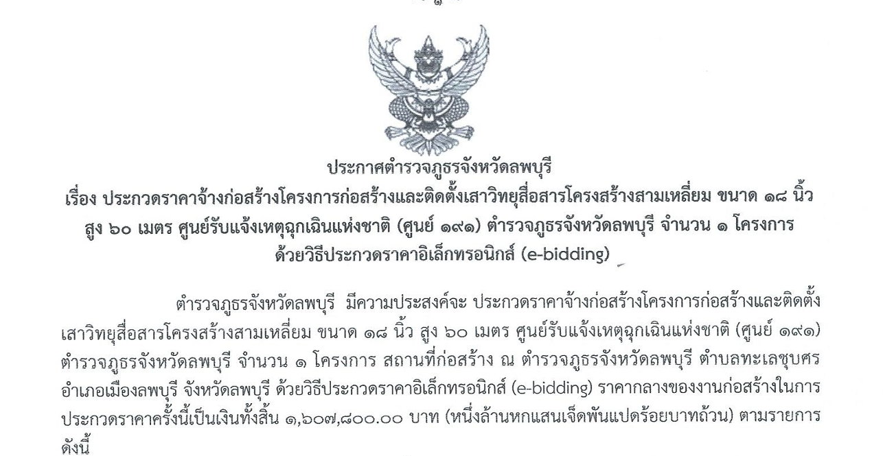 ตำรวจภูธรจังหวัดลพบุรี มีความประสงค์จะ ประกวดราคาจ้างก่อสร้างโครงการก่อสร้างและติดตั้ง เสาวิทยุสื่อส