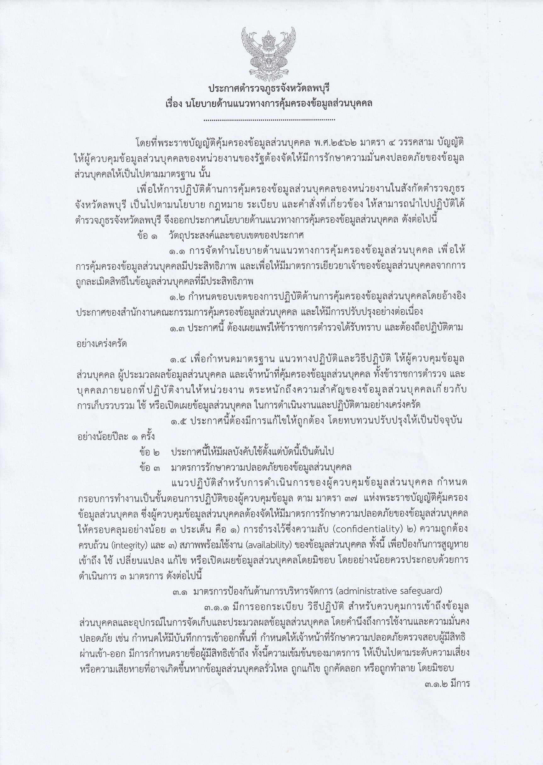 ประกาศตำรวจภูธรจังหวัดลพบุรี เรื่อง นโยบายด้าน แนวทางการคุ้มครองข้อมูลส่วนบุคคล รายละเอียดปรากฏตามเอ