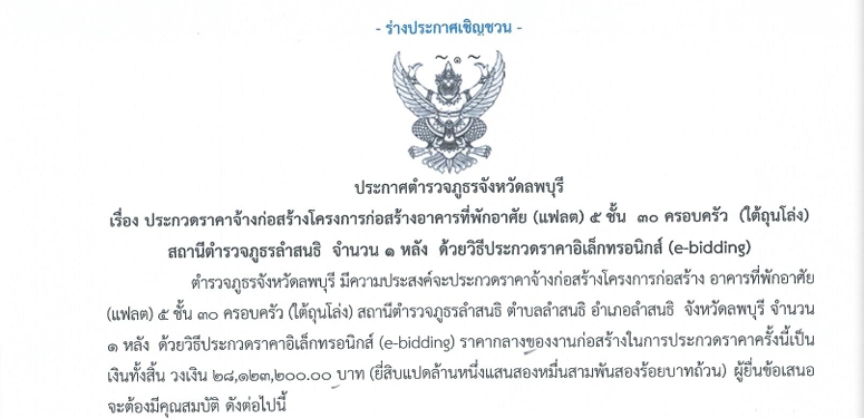ประกาศตำรวจภูธรจังหวัดลพบุรี เรื่อง ประกวดราคาจ้างก่อสร้าง แฟลต 5 ชั้น 30 ครอบครัว สภ.ลำสนธิ ด้วยวิ