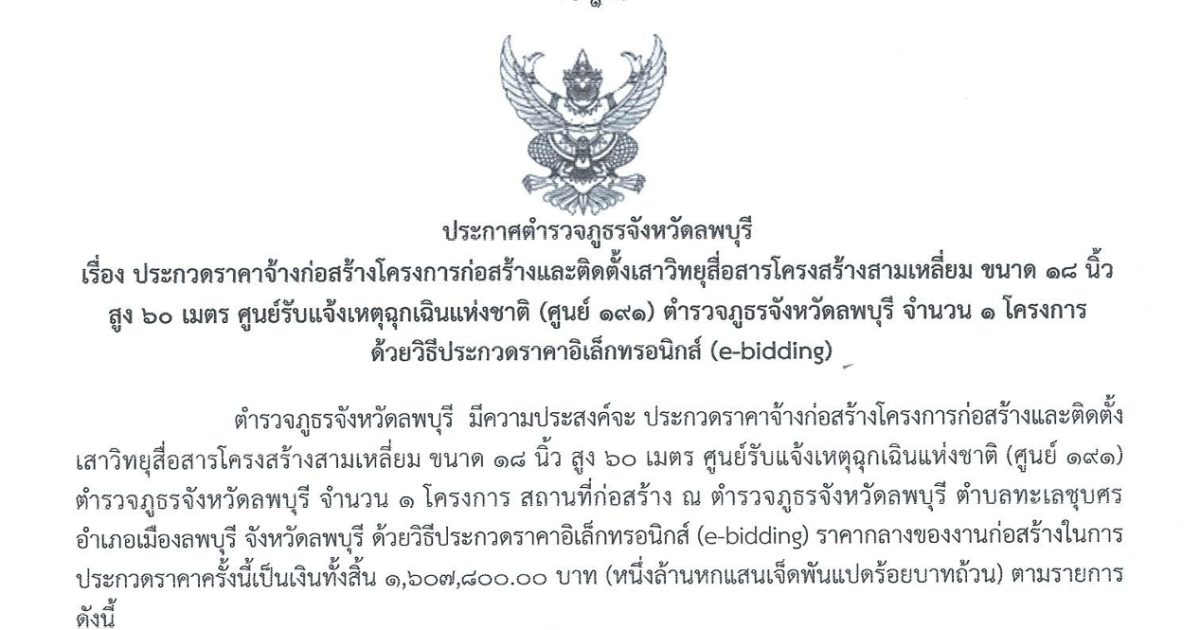 ประกวดราคาจ้างตำรวจภูธรจังหวัดลพบุรี (เสา