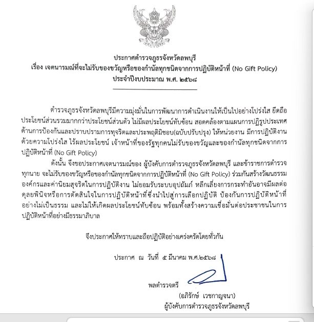 ประกาศเจตนารมณ์ของผู้บังคับการตำรวจภูธรจังหวัดลพบุรีและข้าราชการตำรวจในสังกัดทุกนาย